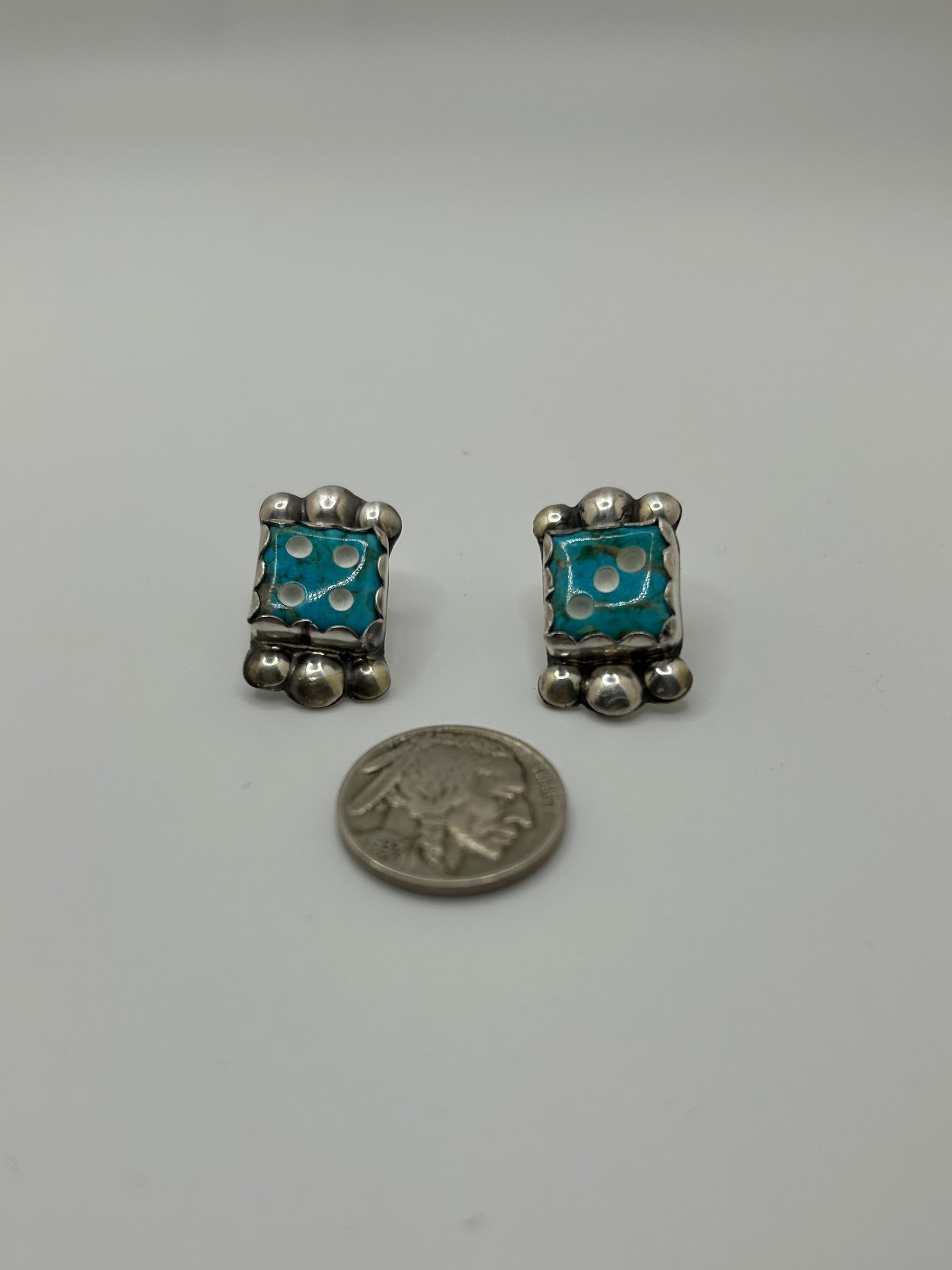 These dice are set in Sterling Silver and have a Scalloped Sterling border. They are surrounded with Sterling dots and have a 3/8" post 2/3 of the way up. They are Kingman dice and carry Lujan Silver Stamp.