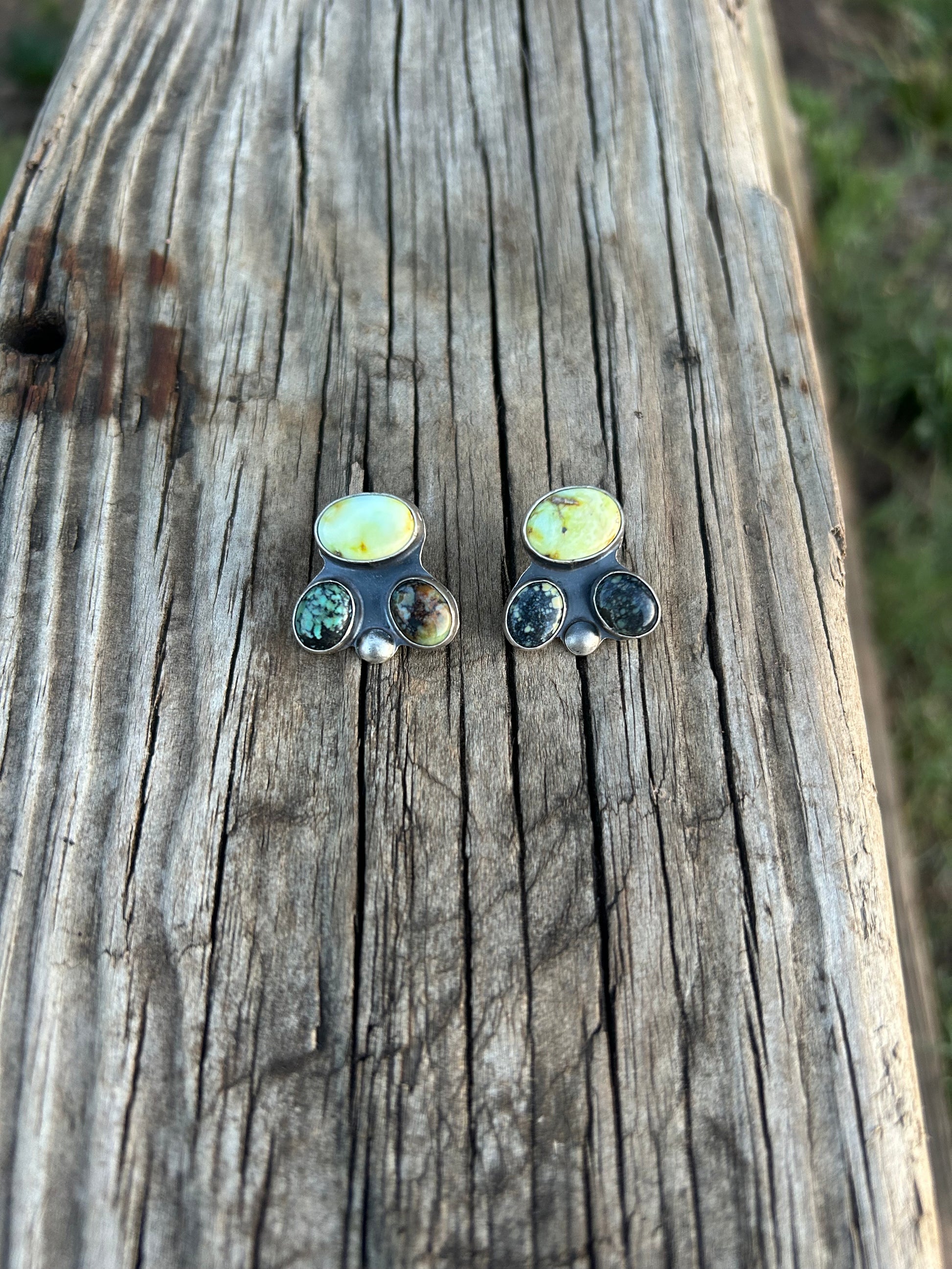 These Palomino and Newlander Stud Earrings are set in sterling silver. They have a 3/8 post and heavy post nut. They have one sterling silver accent and are antiqued. They carry our older Lujan Silver stamp.